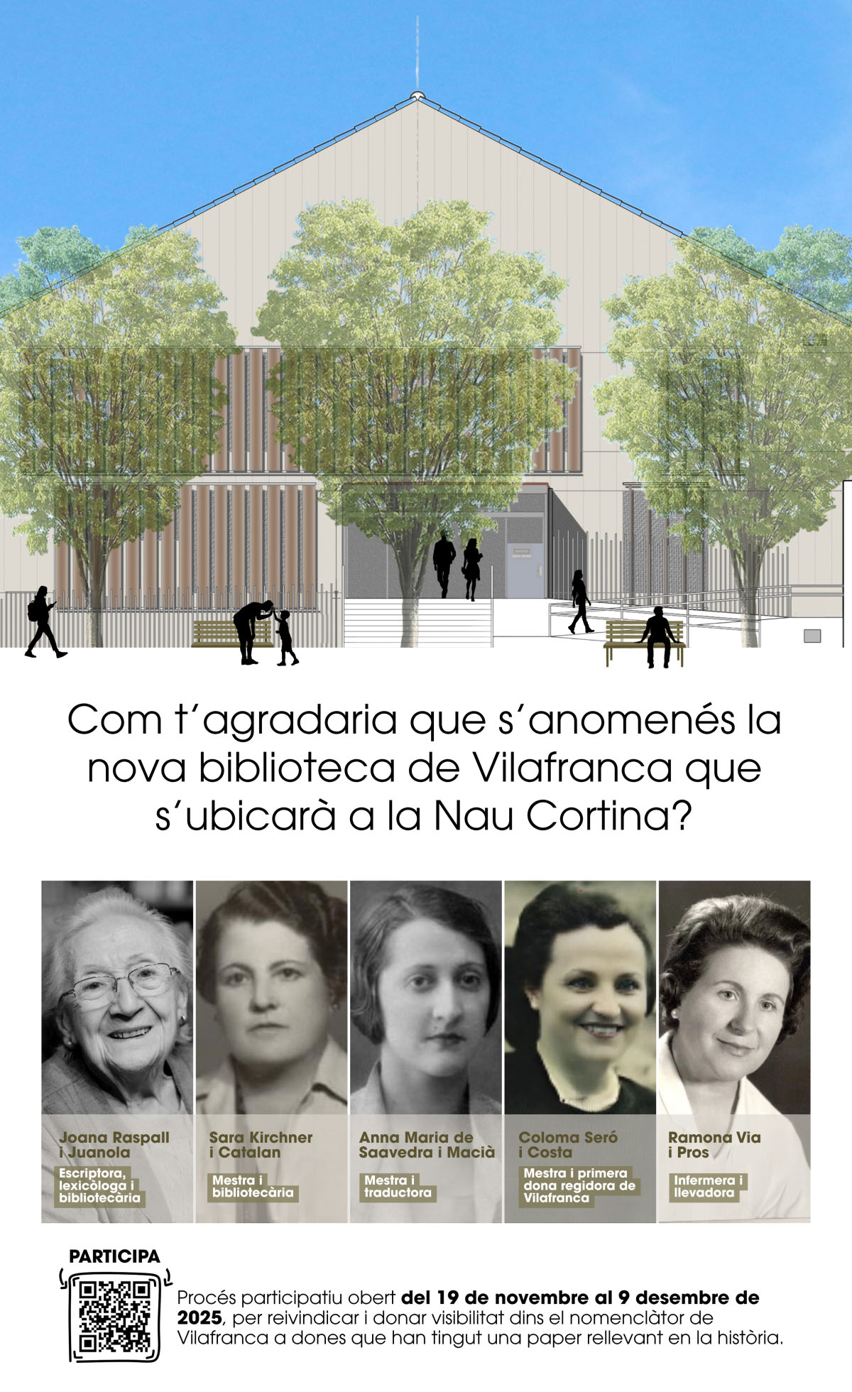 L’Ajuntament de Vilafranca del Penedès ha obert una consulta perquè la ciutadania decideixi el nom de la nova biblioteca municipal, que s’ubicarà a la Nau Cortina, al barri del Molí d’en Rovira. La rehabilitació de l’edifici, que és la primera fase d’aquest nou equipament, es troba ja en una fase avançada i es preveu que la nova biblioteca entri en funcionament passat l’estiu de 2026.