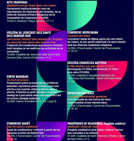 A més, es podrà visitar: la Comunitat Musulmana de Vilafranca, la Comunitat Bahà’í, la Comunitat budista de l’interésser, l’Església de Jesucrist dels Sants dels Darrers Dies, Sukyo Mahikari, l’Església Baptista, Espiritualitat laica i les Parròquies de Vilafranca- Església catòlica.