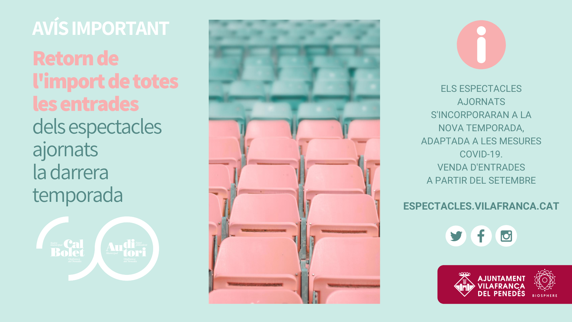 A causa de la Covid-19 van quedar ajornats els espectacles de març a juny del Teatre Cal Bolet i l’Auditori Municipal de Vilafranca, donant així per finalitzada la temporada d’espectacles febrer-juny 2020 d’arts escèniques i musicals en viu. Inicialment es van reprogramar tots els espectacles ajornats i es va procedir a fer el retorn de les entrades a totes les persones que ho van sol·licitar. Paral·lelament es va bloquejar la venda de tots els espectacles a l’espera de la definició del pla de represa cultural del Procicat.