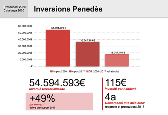Els nous pressupostos de la Generalitat per al 2020 destinaran 54.594.593 € a les comarques de la demarcació del Penedès, un increment del 49% sobre el pressupost del 2017, i el que suposa una inversió de 115 € per habitant. El Penedès és la 4a demarcació territorial que rep més inversió en els pressupostos de la Generalitat.