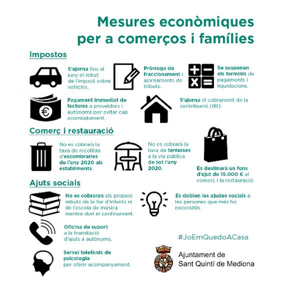 L’Ajuntament de Sant Quintí de Mediona ha acordat un paquet de mesures econòmiques que adoptarà per mitigar els efectes del coronavirus en el teixit comercial i les famílies. Aquestes mesures s’han pres després que durant els primers dies de la crisi s’hagi centrat en adoptar i traslladar a la ciutadania les mesures preventives i sanitàries imprescindibles per fer compatible l’obligat confinament social i la garantia en la prestació dels serveis públics essencials.