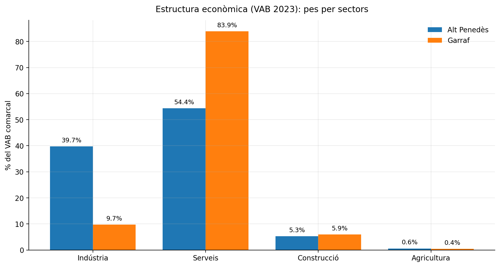 Aquesta proporció situa l’Alt Penedès molt per sobre de la mitjana catalana i confirma el seu perfil clarament industrial. Les activitats agroalimentàries, vitivinícoles i de transformació van concentrar gairebé el 68% del VAB industrial, posicionant la comarca com un dels principals referents de la indústria tradicional a Catalunya.