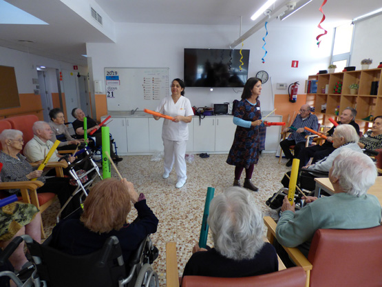 RR: Comencem amb una cançó o activitat de benvinguda. En aquest cas, n'hem fet una expressament per poder situar on estem, quin dia és i fer que diguin el seu nom. Després fem alguna activitat d'escoltar cançons de les seves èpoques i que les cantin. També portem instruments perquè els puguin tocar i així treballem els ritmes, la posició corporal, el record de les lletres, la coordinació... Malgrat que la majoria d’avis estan asseguts en cadires, també fem ball i moviment amb mocadors, cintes... Per acabar fem una activitat de finalització com pot ser cantar Adiós con el corazón, que els agrada molt, i una activitat de relaxació. Després fem un diari de sessions per veure què ha anat bé i què no. És molt important l’observació, per tal de tornar a repetir les activitats o recollir suggeriments que et facin els propis àvis.