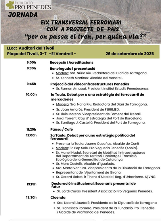El cartell adjunt mostra una jornada respecte del tren, de la mobilitat, del transport de béns i persones a l’eix transversal, feta al Vendrell el passat 26 de setembre.