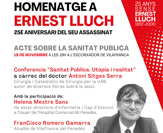 El PSC de Vilafranca organitza un acte d’homenatge a Ernest Lluch amb motiu del 25è aniversari del seu assassinat, per recordar la seva figura i "reivindicar el seu llegat com a impulsor de la sanitat pública universal". L’acte tindrà lloc el dimecres 19 de novembre a les 19h a l’Escorxador de Vilafranca.