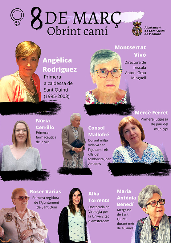 Concretament, la campanya sota el nom “Obrint camí” va posar en valor la tasca de 8 dones del municipi que han estat pioneres. Així, les protagonistes van ser Maria Antònia Benedí, primera metgessa del municipi i que hi ha exercit durant més de 40 anys; Roser Varias, primera regidora; Angèlica Rodríguez, primera alcaldessa (1995-2003); Mercè Ferret, primera jutgessa de pau; Alba Torrents, doctorada en Virologia per la Universitat d’Amsterdam; Núria Cerrillo, primera i actual farmacèutica de Sant Quintí; Montserrat Vivó, directora durant molts anys de l’Escola Antoni Grau Minguell, i Consol Mallofré, secretària i col·laboradora del folklorista Joan Amades.