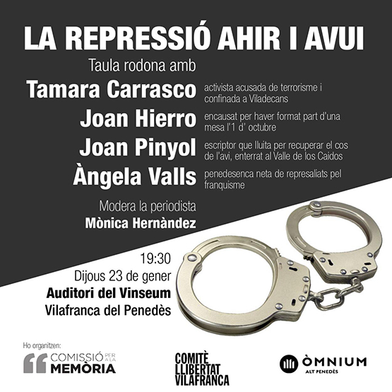 Òmnium Alt Penedès, el Comitè Llibertat de Vilafranca i la Comissió per la Memòria organitzen per al proper dijous 23 de gener, a les 19.30h, a l’Auditori del Vinseum la taula rodona La repressió ahir i avui.