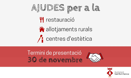 L’Ajuntament de Sant Martí Sarroca ha aprovat donar unes ajudes extraordinàries de 700 € als titulats dels establiments de restauració, allotjaments rurals o centres d’estètica, afectats per cessament o reducció d’activitat a conseqüència de les limitacions imposades per les resolucions del Departament de Salut de la Generalitat de Catalunya SLT/2546/2020, de 15 d’octubre, i SLT/2700/2020, de 29 d'octubre, dins del marc de la crisi del Covid-19.