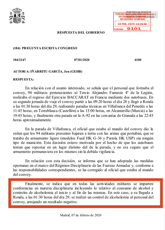 Segons el ministeri, davant aquesta decisió de l'oficial "s'han pres les mesures oportunes", però no s'informa de quines són, motiu que critica el diputat que va fer la pregunta. El text acaba dient que "en totes les activitats militars s'imparteixen conferències en materia disciplinària, també sobre el consum d'alcohol i els controls d'alcoholèmia que es realitzena l'inici i al final de les activitats".
