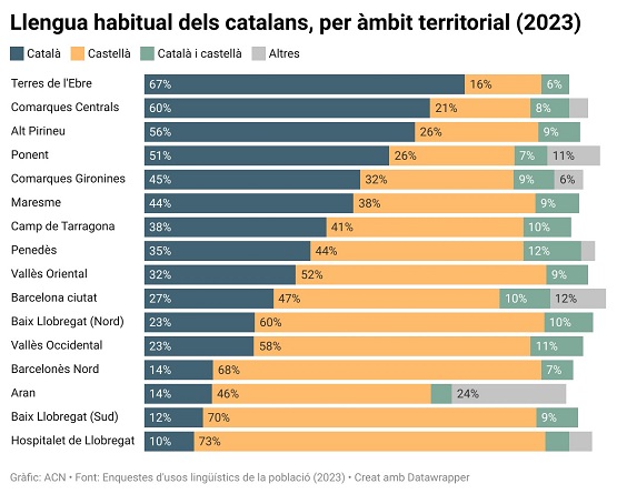 Les dades situen el Penedès per sota de la mitjana del país i molt lluny de territoris com les Comarques Centrals (59,6%) o les Terres de l’Ebre, on el català continua sent majoritari. Només l’Àrea Metropolitana de Barcelona, Vallés Oriental i Occidental i Aran, amb registres inferiors al 25% en la majoria de casos, presenten una proporció menor d’ús habitual exclusiu del català.