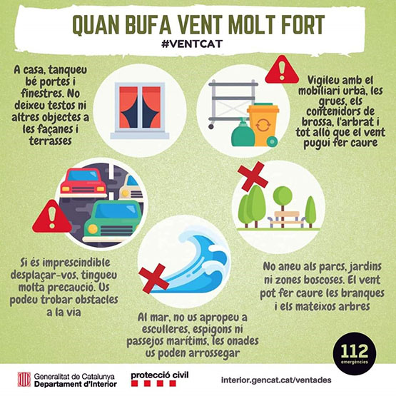 Des de Protecció Civil recomenen prudència en els desplaçaments i en les activitats a l'aire lliure davant el fort vent previst per avui. També recorden els consells habituals en aquest tipus d'alerta.