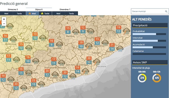 El Servei Meteorològic de Catalunya (Meteocat) ha emès una alerta a la població davant el temporal que travessarà el país aquest dijous. A part de la disminució de les temperatures, amb màximes d’uns 17 graus a l’Alt Penedès, es preveuen fortes precipitacions a la comarca.