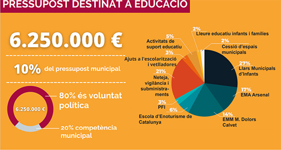 El suport econòmic als centres es tradueix en 400.000 euros, 300.000 dels quals es destinen a activitats de suport educatiu, i 100.000 a programes d’ajuts a l’escolarització i vetlladores. Respecte a les primeres, el consistori programa 102 activitats (teatre, piscina, música, emprenedoria, educació viària, etc.) a 20 centres educatius, totes dins de l’horari lectiu, amb més de 35.260 participacions per part dels alumnes, fet que representa un cost de 56 euros per cadascun.