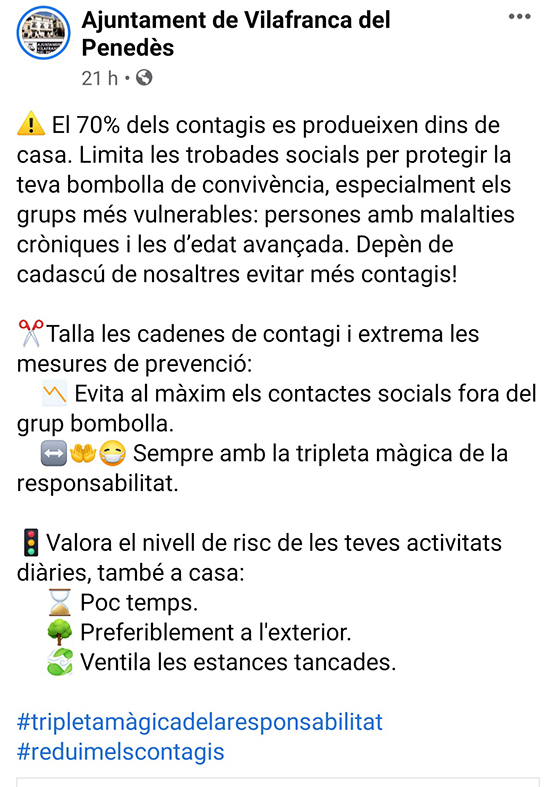 L’Ajuntament de Vilafranca ha posat en marxa una campanya a les xarxes socials per posar èmfasi en la importància de la limitació de les relacions socials per reduir el nombre de contagis de la COVID19. En els darrers dies han aparegut estudis que assenyalen que el 70% dels contagis es produeixen a la llar. Així ho indica un estudi fet entre els mesos d’octubre i desembre pel servei de vigilància epidemiològica del Departament de Salut de la Generalitat de Catalunya. El 56% dels casos tenen la seva causa directa en algun membre de la família que es va contagiar en dinars, sopars o algun altre tipus d’activitat social.