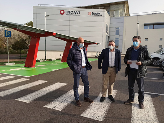 L'alcalde de Vilafranca, Pere Regull; el regidor d'Urbanisme, Francisco Romero; i el regidor de Promoció Econòmica, Joan Manel Montfort; han visitat aquest matí les noves “fotolineres” de l’aparcament del Centre Àgora i les obres de remodelació de l’edifici.