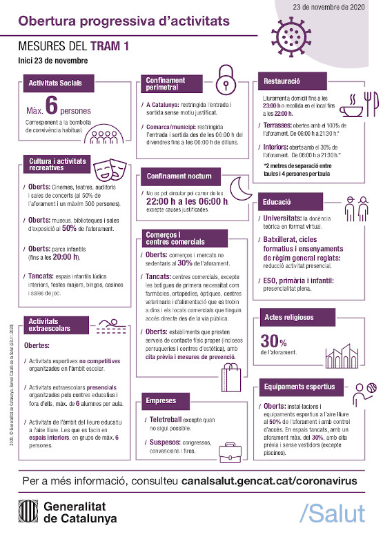 La consellera de la Presidència ha estat l'encarregada d'explicar els diferents trams. En el primer, que començarà dilluns vinent, 23 de novembre, una de les principals novetats és que permetrà la reobertura del sector de la restauració entre les 6h i les 21.30h amb un aforament del 100% a les terrasses i del 30% a l'interior, sempre en taules de grups de quatre persones situades a dos metres de distància entre grups diferents. Podran ser més si formen part de la mateixa bombolla.