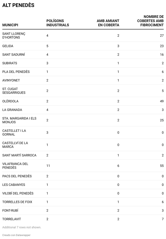 El municipi més afectat és Vilafranca del Penedès, amb 55 cobertes de fibrociment en 6 dels seus 11 polígons industrials, seguit d’Olèrdola (49 cobertes) i Sant Llorenç d’Hortons (27). També destaquen Santa Margarida i els Monjos (25) i Sant Pere de Riudebitlles (25). En canvi, Castellet i la Gornal, Castellví de la Marca, Pacs del Penedès, Les Cabanyes i Vilobí del Penedès no registren cap presència d’amiant, tot i comptar amb polígons.