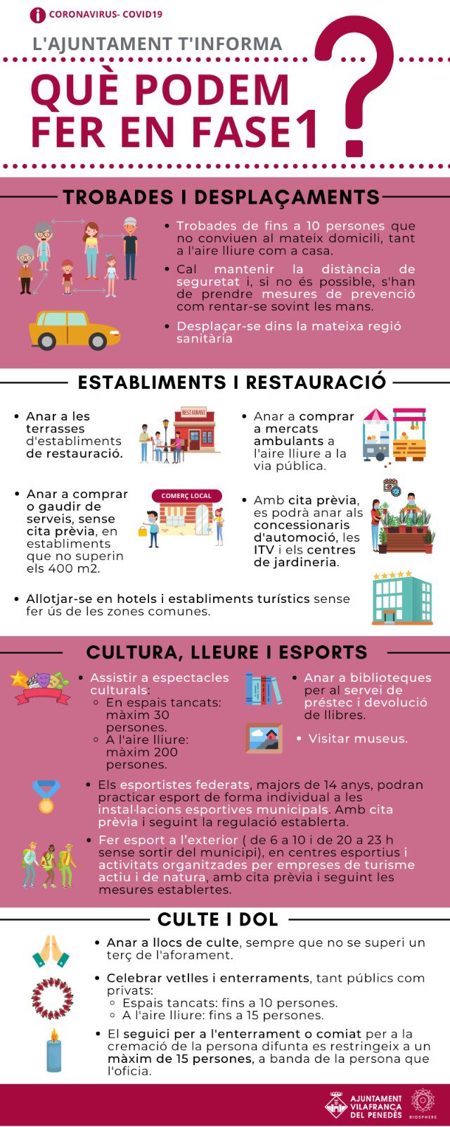 A la resta de municipis de l'Alt Penedès es podrà fer les activitats permeses a la Fase 1 del desconfinament que recull el BOE, i son les següents: