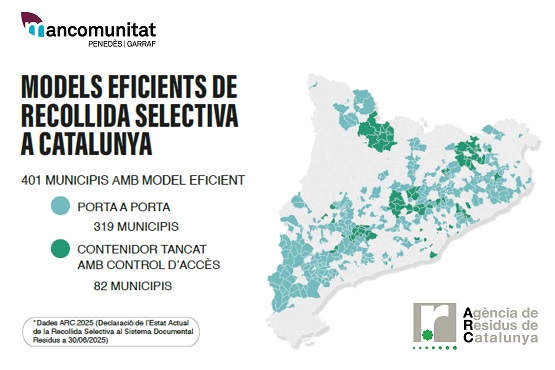 Dos municipis de la Mancomunitat Penedès-Garraf han aconseguit una fita destacada en l'àmbit de la gestió de residus a Catalunya. Sant Pere de Riudebitlles i Torrelavit s’han situat al top 5 de les poblacions catalanes amb un percentatge més alt de recollida selectiva, segons les darreres dades publicades per l'Agència de Residus de Catalunya (ARC).