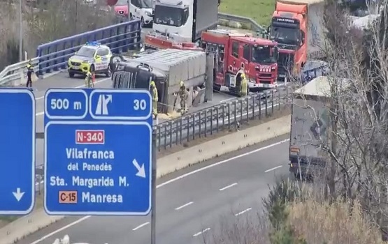 L'AP-7 està tallada a Santa Margarida i els Monjos en sentit sud (Tarragona) per un camió que transportava porcs que ha bolcat. L'accident ha passat a les 11.35 hores al punt quilomètric 200 de l'autopista. Hi treballen equips d'emergència, entre els quals hi ha tres patrulles dels Mossos d'Esquadra i quatre dotacions de Bombers de la Generalitat.