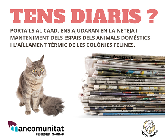 El Centre d’Acollida d’Animals Domèstics (CAAD) del Penedès fa una crida ciutadana per recollir diaris. El paper de diari, resulta molt útil en el centre a l’hora de fer les tasques de neteja i de manteniment de les zones i estances dels animals, així com per a l’aïllament tèrmic de les colònies felines. El centre subratlla la necessitat que siguin diaris comuns, de mida estàndard i no revistes o paper setinat, ja que no tenen capacitat d’absorció.