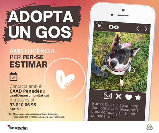 El Centre d’Acollida d’Animals Domèstics (CAAD Penedès) de la Mancomunitat Penedès-Garraf impulsa una nova campanya per fomentar l’adopció gossos i gosses de races qualificades com a potencialment perilloses (GPP’s). Amb el lema «Gossos amb llicència per fer-se estimar» i adoptant una estètica familiar a les aplicacions mòbils i webs de cites, els gossos es presenten i donen a conèixer les seves principals característiques i virtuts buscant adoptants a qui donar amor i companyia.