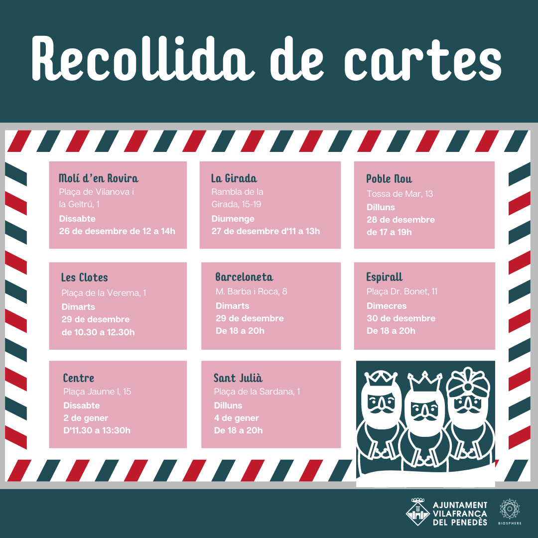 Enguany la recollida de cartes per als Reis d’Orient serà diferent als altres anys donada la situació de la pandèmia. Aquesta vegada el patge reial Raimon farà arribar una bústia itinerant a tots els barris de Vilafranca. Aquesta bústia romandrà a l’entrada dels locals dels les Associacions de Veïns de la Vila, custodiada per dos Guàrdies Reials, uns personatges ben coneguts dels infants perquè cada any acompanyen les carrosses dels tres Reis. D’aquesta manera els infants podran deixar la carta de forma ràpida, evitant la concentració de persones i garantint la distància de seguretat.