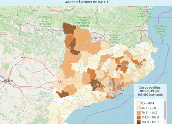 El departament de Salut de la Generalitat de Catalunya ha publicat un mapa interactiu sobre l’evolució dels casos de coronavirus, per zones i municipis. També s’informa sobre els resultats de les anàlisis que s’han fet des de principi del mes de març, amb els positius i negatius, per sexes, edats i regió sanitària. La informació s’actualitza diàriament.