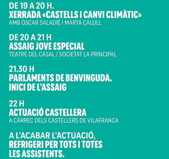 L’endemà, dissabte 20 de setembre a les 17h, sortint des de la Rambla de Sant Francesc, els Castellers de Vilafranca organitzen una nova edició de la Pedalada Verda, en el marc de la Setmana Europea de la Mobilitat. La participació a la pedalada és gratuïta i el repartiment dels dorsals es farà el mateix dissabte a partir de les 16:30h.