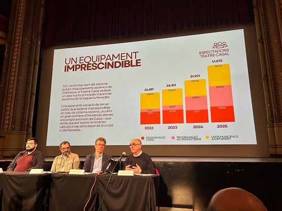 Durant la presentació, Salvador Casals va defensar el paper actual del Casal amb dades a la mà. El 2025 el teatre va acollir 41.800 espectadors i va estar ocupat 178 dies. Molta gent arriba de fora de Vilafranca, especialment de la vegueria i de l’àrea metropolitana de Barcelona. “Som un teatre associatiu, però fem un servei públic”, va insistir.