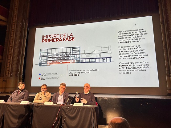 El gerent Salvador Casals va descriure la realitat de l’equipament sense embuts. A la sala, des de 1921, pràcticament no s’hi ha fet res. Hi ha danys per aigua, tèrmits, despreniments, materials envellits, butaques trencades i zones fora de servei. “Quan abaixem la llum per començar els espectacles, tot això no es veu, però hi és”, va resumir. Tot i que va deixar clar que no hi ha un risc estructural immediat per als espectadors, sí que va advertir que no es podia començar un nou hivern sense actuar.