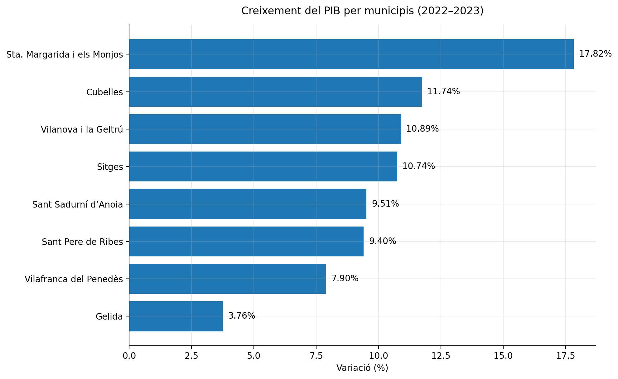 Vilafranca, com a capital comarcal, va mantenir un paper clau en volum econòmic, amb un increment del 7,90%, mentre que Sant Sadurní va registrar un creixement del 9,51%, situant-se lleugerament per sobre de la mitjana del país. Gelida, en canvi, va mostrar una evolució més moderada (+3,76%), tot i mantenir una dinàmica positiva.