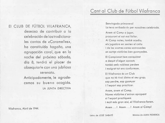 Va ser la veu de l’himne del FC Vilafranca, enregistrat l’any 1979 amb motiu del 75è aniversari. Aquesta peça, inspirada en la caramella de 1944 “Cant al Club de Futbol Vilafranca”, continua sonant abans de cada partit. També va participar en la gravació de l’Himne del Centenari (2004) amb l’Agrupació Polifònica de Vilafranca.