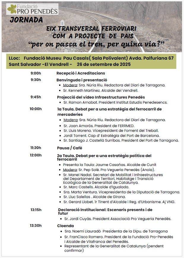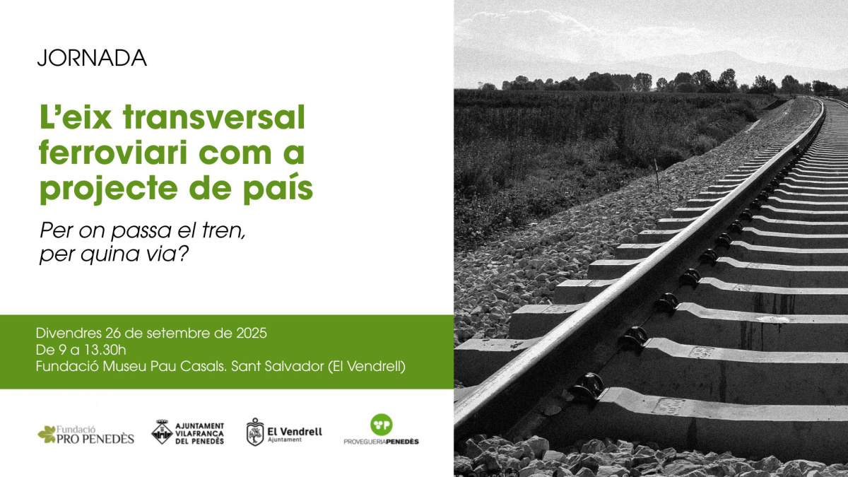 La Fundació Museu Pau Casals del Vendrell acollirà el 26 de setembre una jornada sota el títol “Eix Transversal Ferroviari com a projecte de país: per on passa el tren, per quina via?”. L’acte està organitzat per la Fundació Pro-Penedès, amb la col·laboració dels ajuntaments de Vilafranca del Penedès i del Vendrell i de l’Associació Pro Vegueria Penedès, i posa el territori penedesenc al centre del debat sobre el futur del ferrocarril de mercaderies a Catalunya.