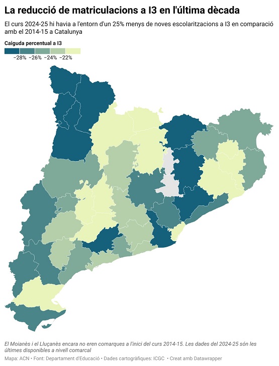 En el cas concret de l’Alt Penedès, el darrer curs d’I3 hi havia matriculats 964 infants (-22,2% respecte el curs 2014-2015) , per tant, la tendència és clara: cada vegada hi ha menys infants d’I3 a les aules. Aquesta disminució s’explica pel fort descens de la natalitat, que el 2022 ja va marcar un mínim en tres dècades. Des de llavors, les xifres de naixements no s’han recuperat.