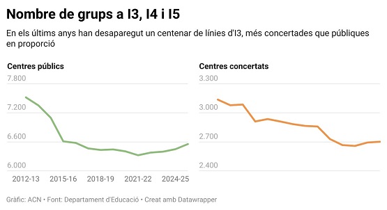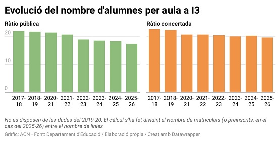 La reducció d’alumnes ha tingut un efecte directe a les aules: les ràtios són notablement més baixes. Si fa vuit cursos la mitjana a la pública era de 22 alumnes per classe, aquest curs se situa al voltant dels 17. A la concertada, la xifra també ha baixat dels 23 als 19,6.