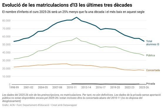 El curs escolar 2025-26 comença avui a Catalunya amb una dada històrica: els infants que s’incorporen a I3 són un 25% menys que fa deu anys, assolint el mínim d’aquest segle. El fenomen també es fa visible al Penedès, on la davallada de la natalitat ha reduït de manera sostinguda el nombre de matriculacions.