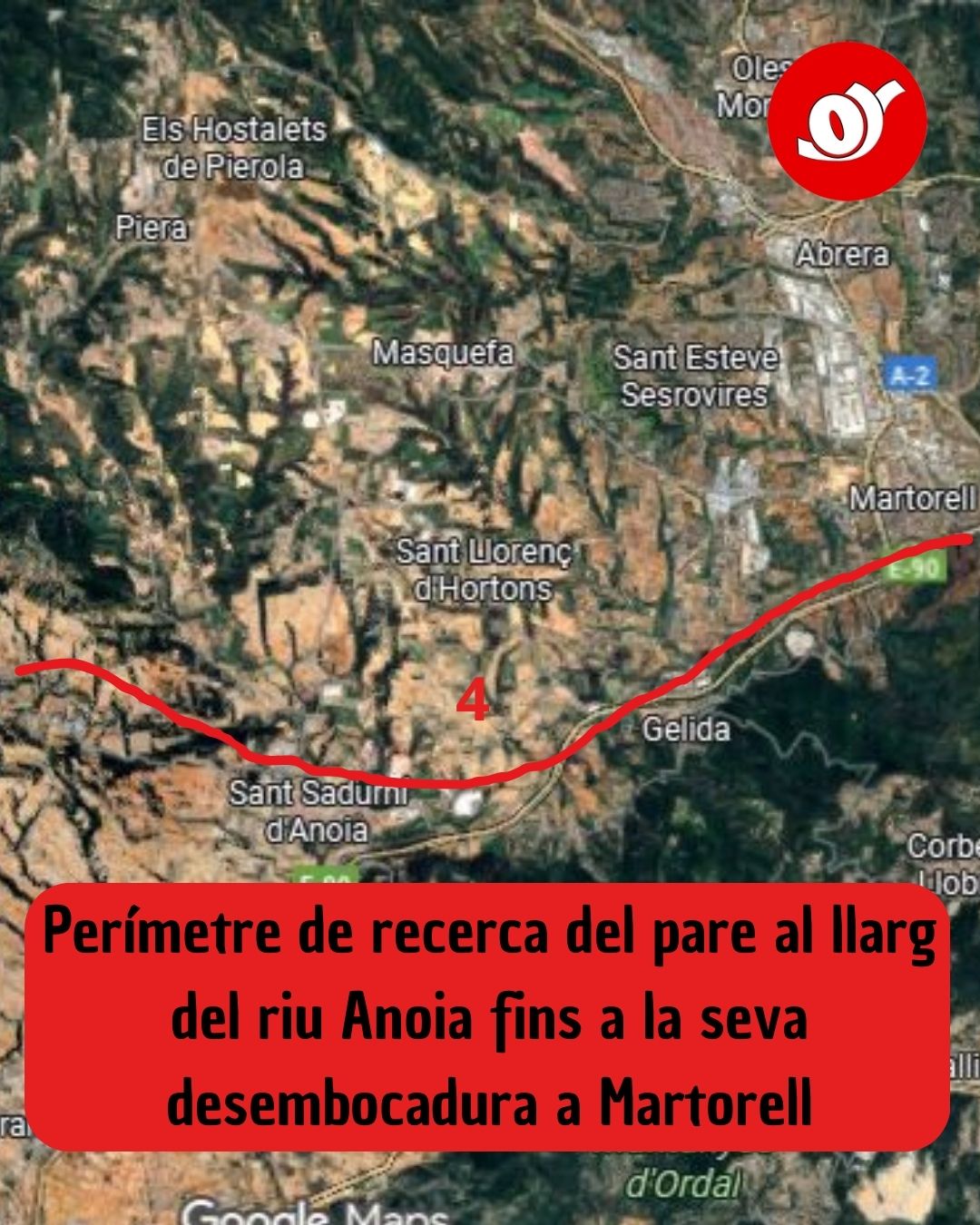 4- Perímetre de recerca amb drons de més de 10km del riu Anoia on s'està cercant al pare desaparegut (fins a la desembocadura al riu Llobregat, a Martorell)